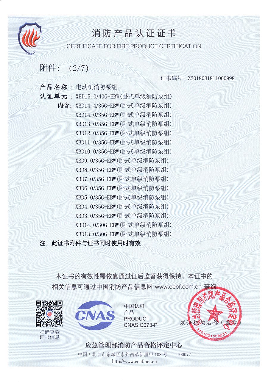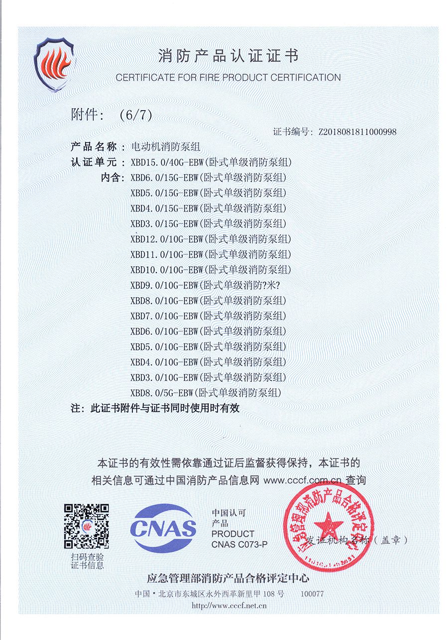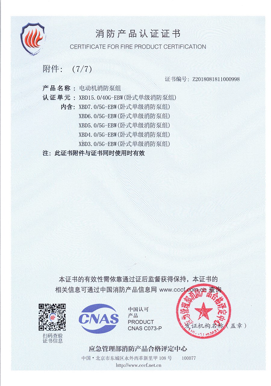 臥式單級EBW-消防產品認證證書