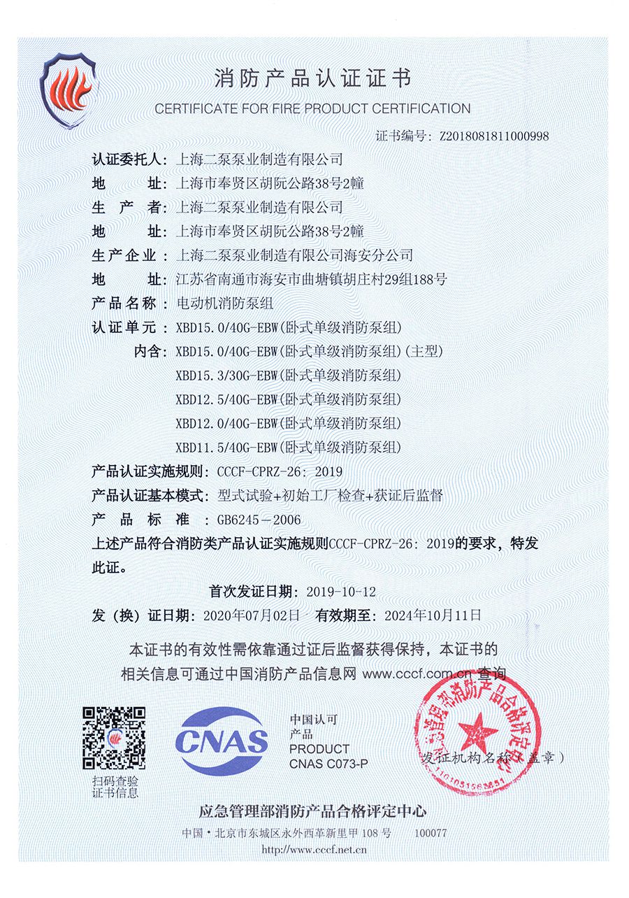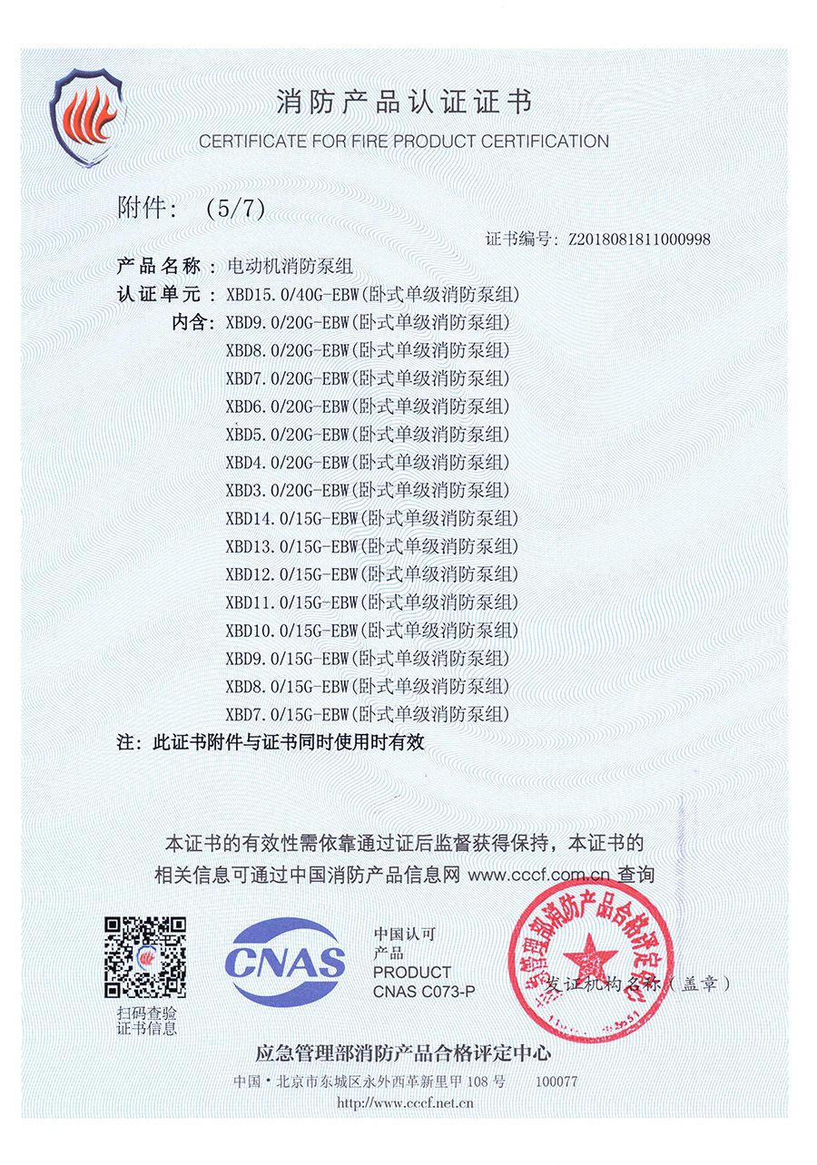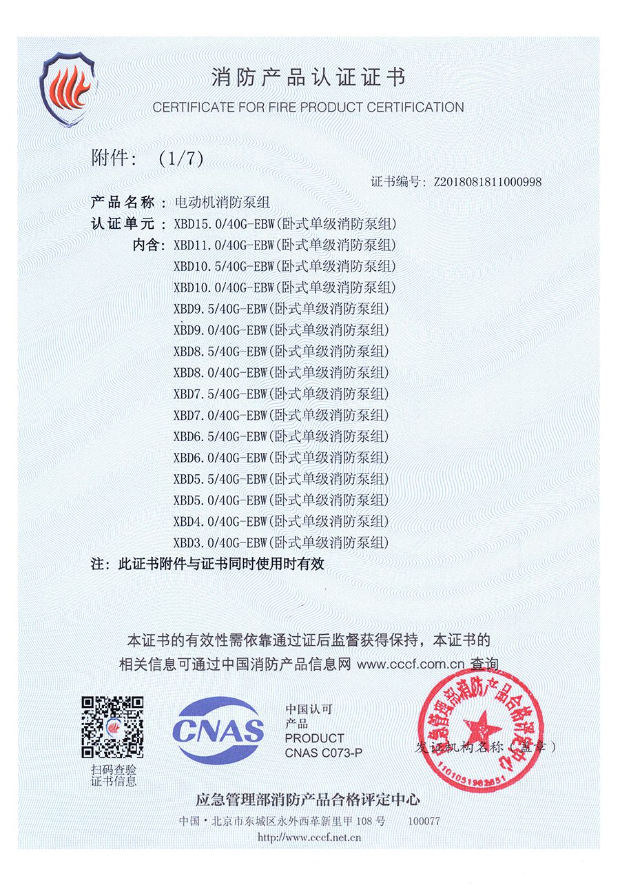 臥式單級EBW-消防產品認證證書